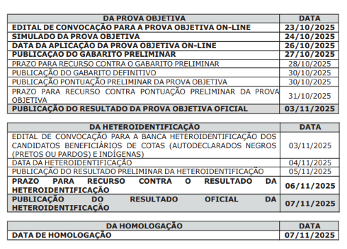 A prova objetiva será realizada no dia 26 de outubro de 2025, às 10h, horário de Brasília. Com isso, outros itens do calendário do processo foram alterados. Confira o novo cronograma: