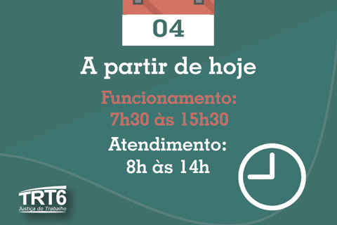 O novo horário de funcionamento do Tribunal Regional do Trabalho da 6ª Região (TRT-PE) tem início nesta segunda (04/01), com o turno único das 7h30 às 15h30 nas unidades judiciárias e administrativas da instituição. A mudança de horário reduzirá em uma hora o consumo diário de energia, além de evitar o dispêndio a partir das 17h, quando o preço do quilowatt-hora fica mais caro. O atendimento ao público, entretanto, não sofrerá alterações, permanecendo das 8h às 14h.