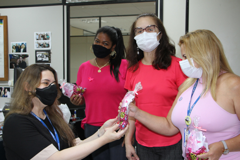 Durante todo o dia, equipes do Núcleo de Saúde visitaram as unidades judiciais e administrativas, distribuindo bombons para todas as servidoras com o cartão da campanha, que nesta edição adotou o lema: “Declare seu amor por você mesma. Previna-se. Cuide-se. Celebre a vida!”. A mobilização desta quarta-feira contou com a participação da coordenadora do Comitê Gestor Local de Atenção Integral à Saúde de Magistrados e Servidores do TRT6, desembargadora Ana Cláudia Petruccelli de Lima, e da chefe do Núcleo de Saúde, Semíramis Rocha. A desembargadora Dione Furtado e a coordenadora de Administração de Pessoal, Katia Barros, também apoiaram a iniciativa, confraternizando-se com a equipe reunida no hall do Núcleo de Saúde.