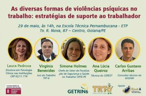A iniciativa tem o apoio da Ejud-6 e demais membros do Grupo Interinstitucional de Prevenção de Acidentes de Trabalho (Getrin6) — MPT-PRT-6, MTE-SRT-PE, AESPE, AATP, AMATRA VI. Na pauta, os subtemas: tipificação do assédio moral e sexual, riscos psicossociais e estratégias de prevenção e intervenção organizacional na prevenção de contencioso trabalhista (por Laura Pedrosa Caldas, diretora de Saúde e Segurança do SINPROES); entendimento jurisprudencial em matéria de violência psíquica no trabalho e o papel do CNJ nas políticas de enfrentamento (por Virgínio Benevides, juiz do Trabalho); atuação da Auditoria Fiscal do Trabalho na Prevenção e Combate à Discriminação e Assédio nos Ambientes de Trabalho (por Simone Holmes, chefe do Setor de Fiscalização de Segurança e Saúde no Trabalho/ SRTE-PE); vigilância dos transtornos mentais relacionados ao trabalho (por Ana Lúcia Queiroz, técnica do Cerest e referência técnica para Vigilância de Transtornos Mentais Relacionados ao Trabalho) e rede de assistência (por Carlos Gustavo Arribas, consultor técnico da Gerência de Atenção a Saúde Mental da Secretaria Estadual de Saúde de Pernambuco - GASAM).