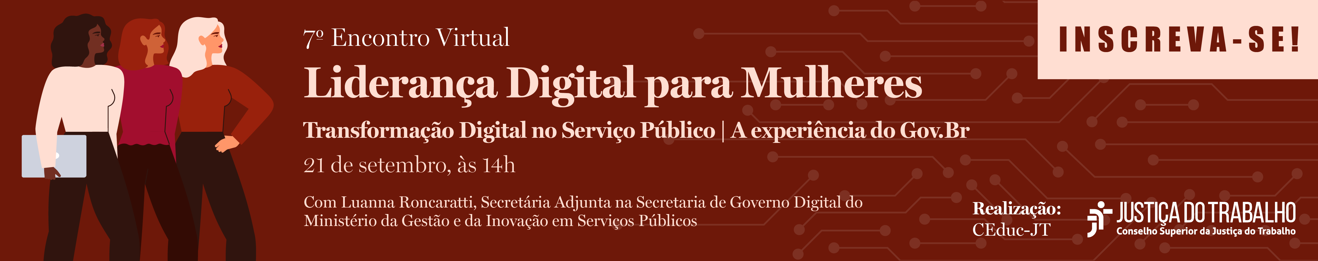 Descrição da Imagem: Banner de divulgação com o texto: "7º Encontro Virtual Liderança Digital para Mulheres. Transformação Digital no Serviço Público - A experiência do Gov.Br; 21 de setembro, às 14h. Com Luanna Roncaratti, Secretária Adjunta na Secretaria de Governo Digital do Ministério da Gestão e da Inovação em Serviços Públicos. Inscreva-se! Realização: CEduc-JT e Justiça do Trabalho - Conselho Superior do Trabalho". O banner possui a cor vinho e a ilustração de três mulheres.