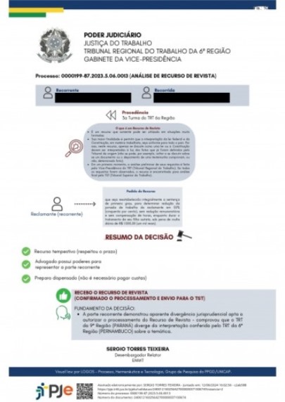 Infográfico - Também alinhado com as recomendações do CNJ, que incentiva o uso de elementos que facilitem a compreensão da informação, por iniciativa do vice-presidente do Regional, desembargador Sergio Torres Teixeira, o TRT-6 vem utilizando infográficos na decisão de alguns recursos como mais uma forma de linguagem simples. Como no exemplo abaixo, a solução utiliza ícones e fluxogramas, que destacam pontos relevantes, permitindo uma rápida visualização do que foi, ou não, acolhido no recurso.