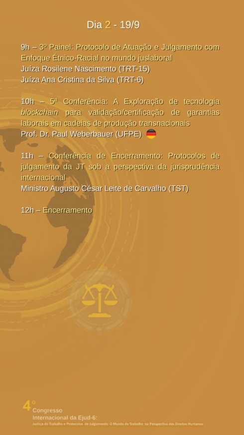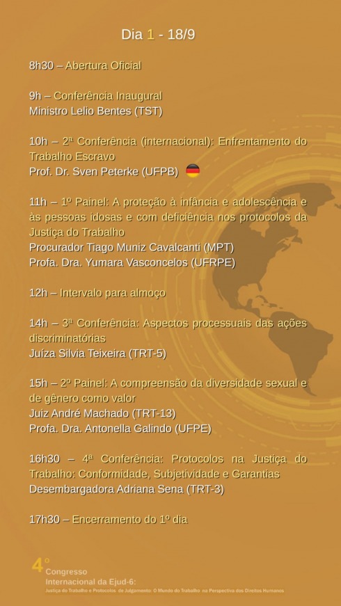 Nos dias 18 e 19 de setembro, a Escola  Judicial promove seu 4º Congresso Internacional. Sob o tema Justiça do Trabalho e Protocolos de Julgamento: O Mundo do Trabalho na Perspectiva dos Direitos Humanos, o objetivo é propor uma percepção sem preconceitos sobre diversidade e inclusão, além de promover o debate sobre a problematica do trabalho escravo contemporâneo, trabalho infantil e outros.