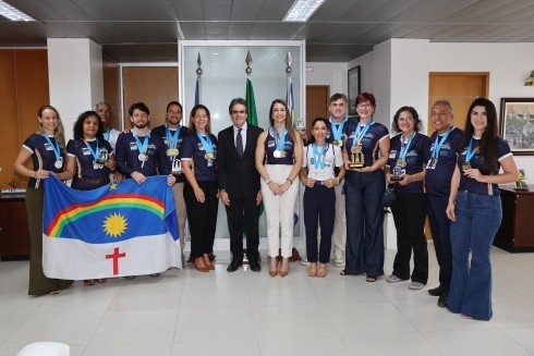 Na manhã da terça-feira (7/10), uma delegação do Grupo de Esportes do Tribunal Regional do Trabalho da 6ª Região (Grude6) esteve no Regional para um encontro com o presidente, desembargador Ruy Salathiel. Na ocasião, agradeceram o apoio dado pela administração às atividades de preparação e participação na 22ª edição da Olimpíada Nacional do Judiciário Federal (ONJF), que, em 2025, aconteceu em Foz do Iguaçu, entre os dias 20 e 26 de setembro.
