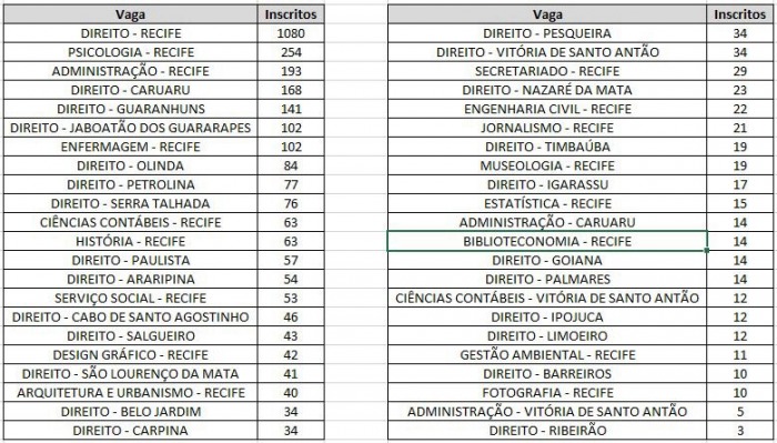 Entre os cursos com maior número de inscritos, destacam-se Direito, Psicologia, Administração e Enfermagem, que tradicionalmente concentram grande procura nos programas de estágio deste TRT6. Confira na imagem abaixo o número de inscritos por curso / localidade: