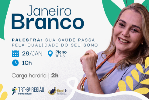 O Tribunal Regional do Trabalho da 6ª região, como parte da programação do Janeiro Branco 2026 - A cura está em mim, promoverá a palestra “Sua saúde passa pela qualidade do seu sono”, com a psicóloga Cláudia Andrade. O evento será na Sala de Sessões do Tribunal Pleno do TRT-6, na quinta-feira (29/1), às 10h.