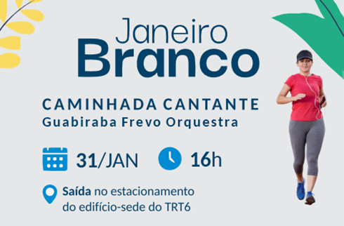 O Tribunal Regional do Trabalho da 6ª região, como parte da programação do Janeiro Branco 2026 - A Cura está em mim, promoverá a Caminhada Cantante, a partir das 16h do sábado (31/1). A atividade é um convite ao movimento, à convivência e à ativação da endorfina, unindo corpo, mente e bem-estar em um momento coletivo de cuidado e leveza, com acompanhamento musical da Guabiraba Frevo Orquestra. A atividade é para o público interno do Tribunal.