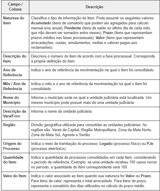 O dicionário abaixo descreve a estrutura dos arquivos CSV disponibilizados nesta página, utilizados como fonte para a elaboração das estatísticas institucionais.